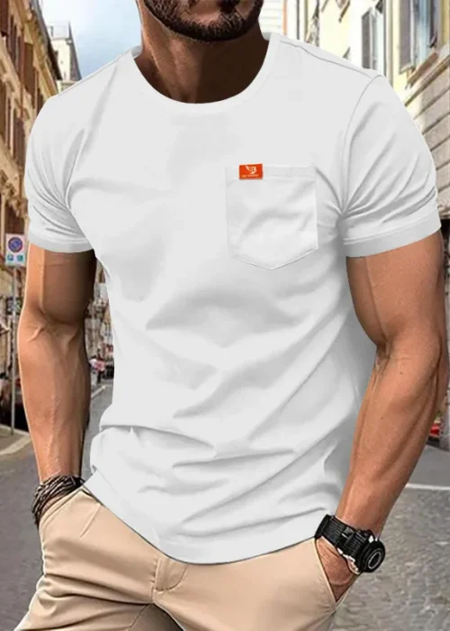 New Men’s Large Size Solid Color Round Neck T-shirt Fashionable Casual Pocket Slim Short-sleeved Top